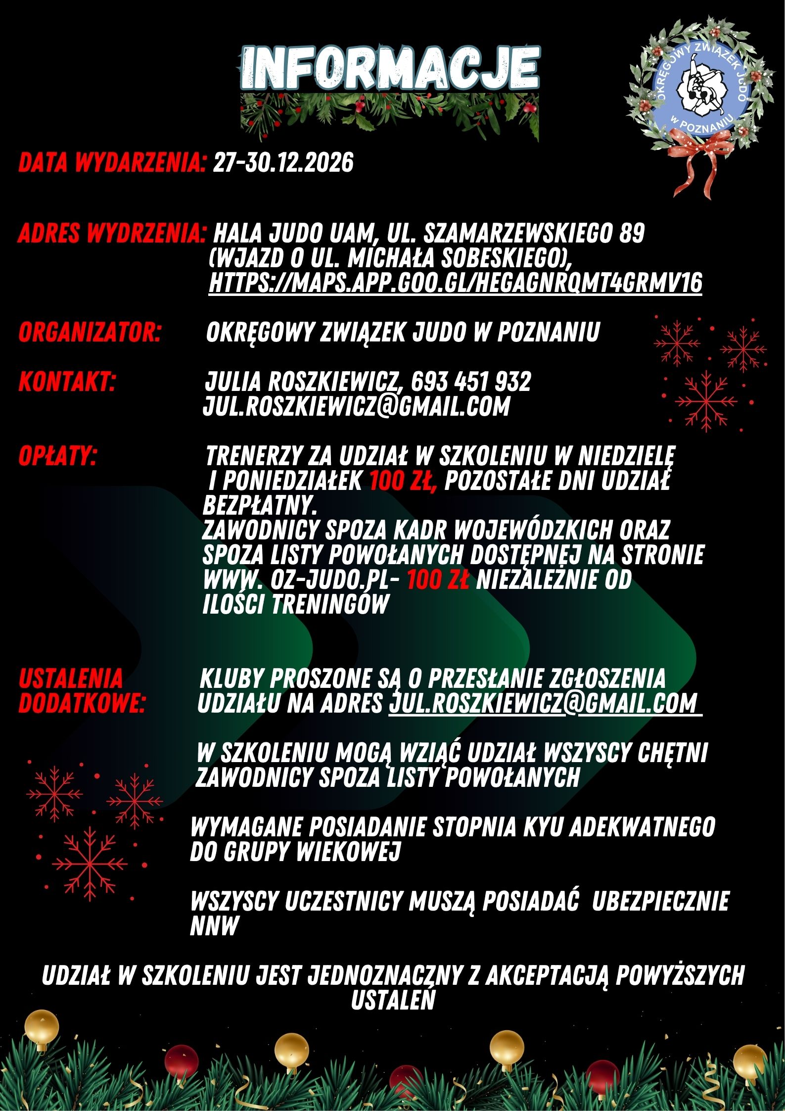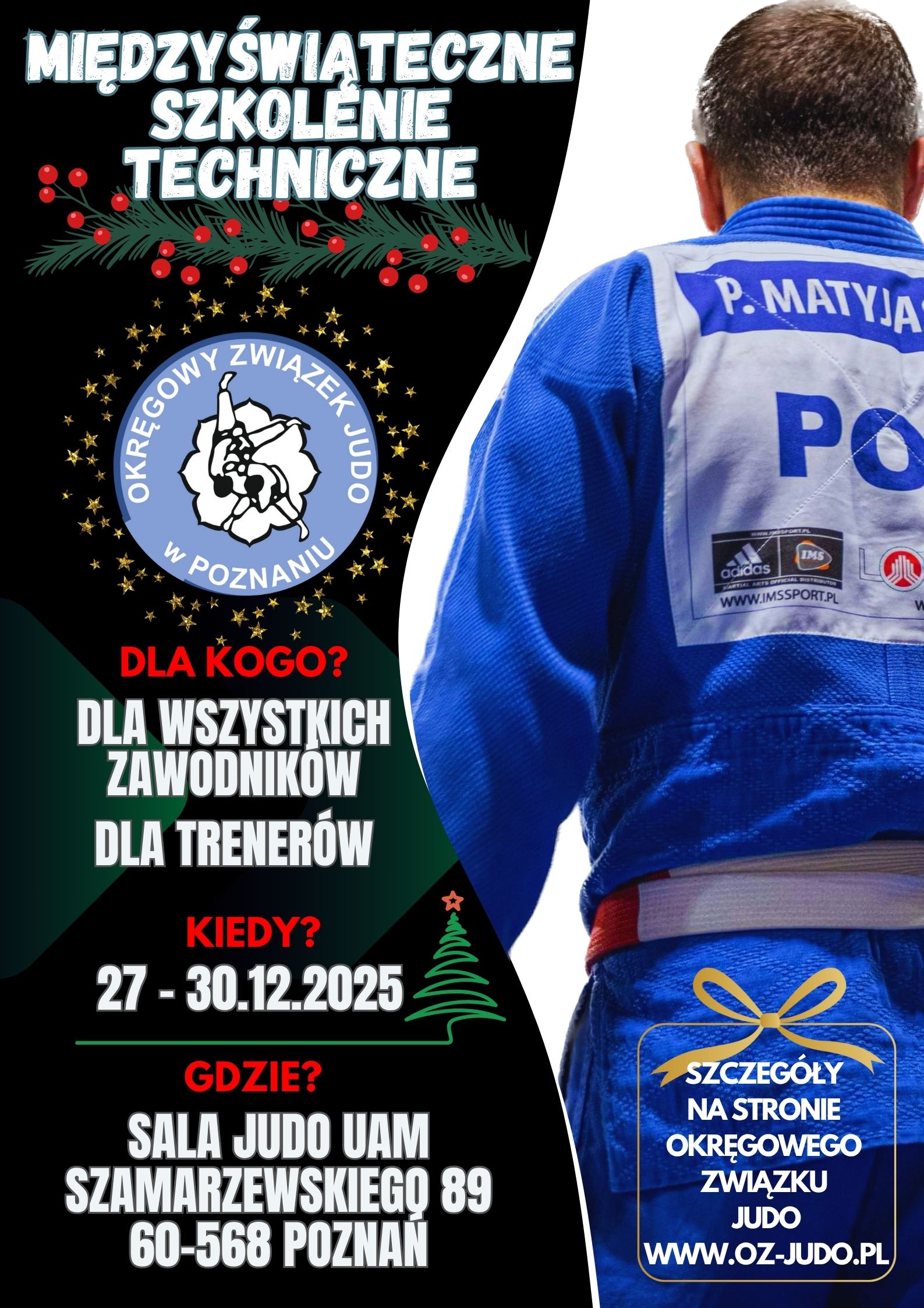 Serdecznie zapraszamy na Międzyświąteczne Szkolenie Techniczne Okręgowego Związku Judo w Poznaniu, które odbędzie się w dniach 27–30 grudnia 2025 w Sali Judo UAM przy ul. Szamarzewskiego 89 w Poznaniu.