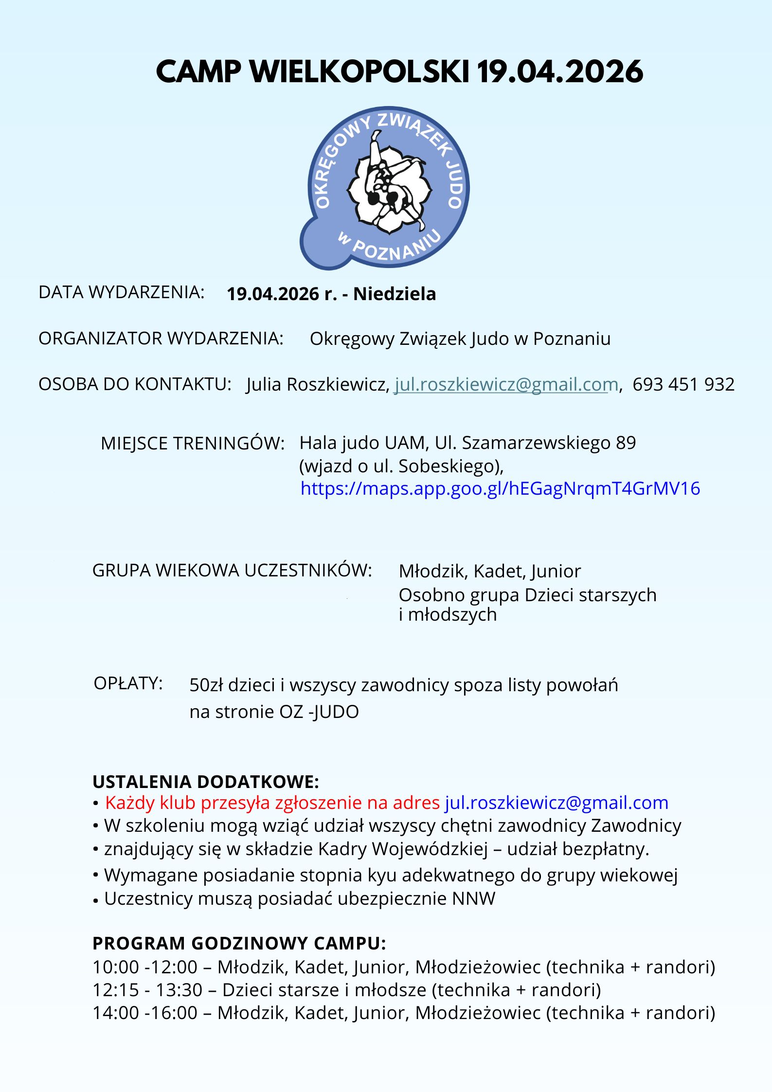 Zapraszamy wszystkich zawodników na Camp Wielkopolski! To doskonała okazja, aby potrenować we wspólnym gronie, podnieść swój poziom sportowy oraz solidnie przygotować się do nadchodzących zawodów.